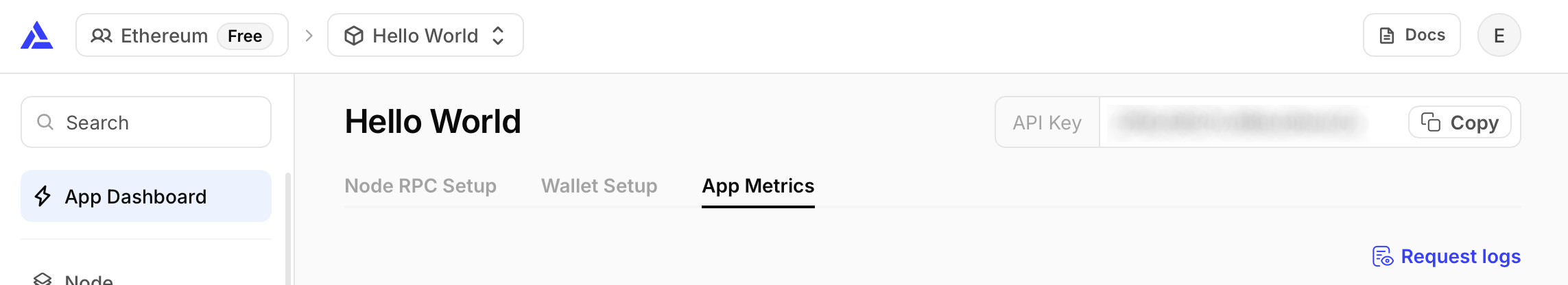 - Name your app “Hello World”, offer a short description, and choose a use case, e.g., "Infra & Tooling." Next, search for "Ethereum" and select the network.